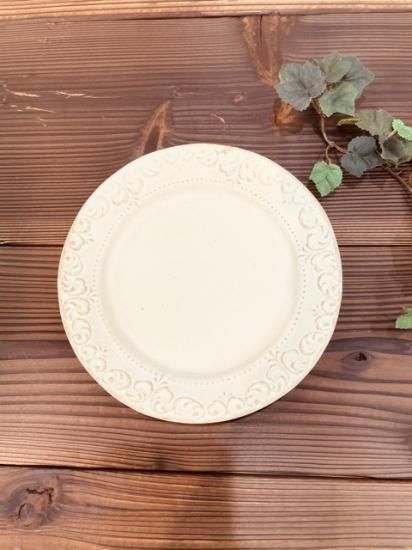 リムにアラベスク模様がレリーフのように彫り込まれ、西洋アンティークの香りを感じさせる器です。手づくりならではの風合いを生かした自然な歪みがお洒落な雰囲気。