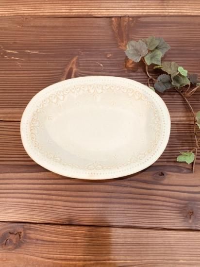 リムにアラベスク模様がレリーフのように彫り込まれ、西洋アンティークの香りを感じさせる器です。手づくりならではの風合いを生かした自然な歪みがお洒落な雰囲気。