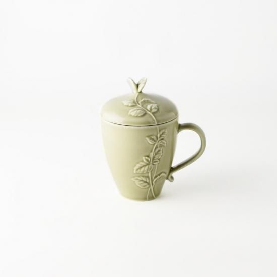 ミントがモチーフの蓋付マグ。大容量のマグは蓋があることで飲み物の温かさを保ちます。