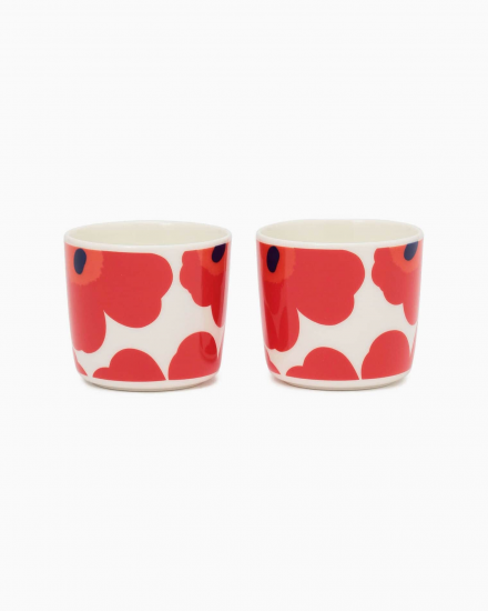 ケシの花モチーフの「Unikko」模様を大胆に配したコーヒーカップセット。ペアで使えるので、パートナーとシェアしたり、結婚祝いのギフトにもぴったりのアイテムです。ハンドルのないシンプルなデザインは、スープカップやデザート皿にしてもOK。