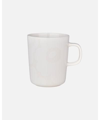 Unikko柄プリントのマグカップ。洗練されたムードのオフホワイト、小さめのハンドルに使いやすいシンプルなフォルムが魅力。大きく配されたケシの花のモチーフが印象的なデザイン。電子レンジ、オーブン、食洗機で使えて機能面も優秀。テーブルコーディネートにマッチするスタイリッシュなアイテムです。