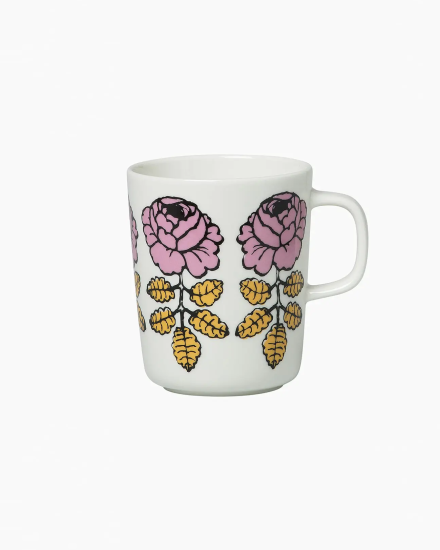 デザイナーMaija Isolaが手がけた、「ウェディングローズ」を意味するVihkiruusu(ヴィヒキルース)柄のマグカップです。普遍的な美しさを感じさせるフラワーモチーフで気分が安らぎ、朝食やお家でリラックスするティータイムのお供にぴったり。コンパクトで手になじむ取っ手もポイントです。