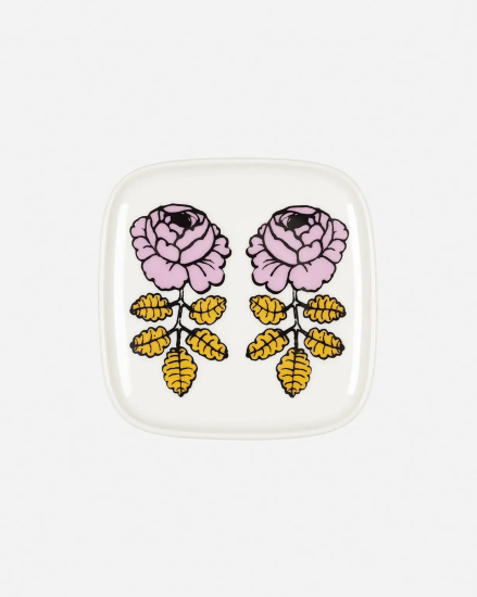 ウエディングローズをモチーフにしたVihkiruusu柄のプレート。角に丸みのあるスクエア型のフォルム。使い勝手の良いサイズで、朝食やティータイムなど様々なシーンで活躍します。食洗機、オーブン、電子レンジ、冷凍と様々な使い方に対応しているのもうれしいポイント。