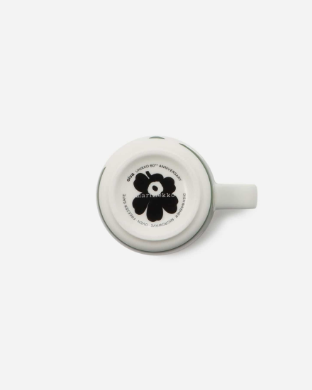 Unikko60周年記念のマグカップ。花のモチーフを大きく配した華やかさ満点のデザイン。小ぶりな持ち手とシンプルで使いやすいフォルムで、デイリーに活躍します。深みのあるグリーン、ヴィヴィッドなオレンジ、差し色のグレーの美しいカラーバランス。テーブルコーディネートのアクセントになるアイテムです。