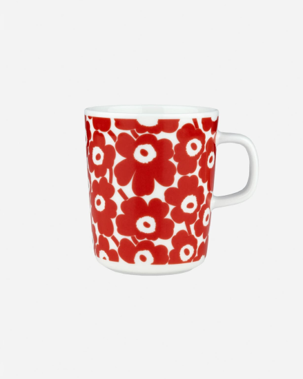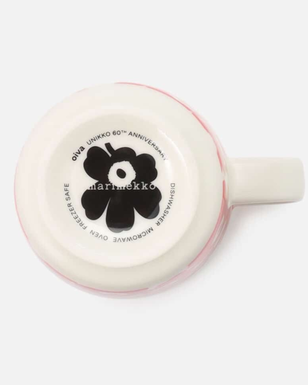 Marimekkoを代表するUnikko柄を全面にプリントしたスタイリッシュなマグカップ。1964年にデザインされたUnikko柄の生誕60周年を記念したアイテムで、底面のアニバーサリーロゴも特徴。小ぶりな持ち手が愛らしいフォルム。テーブルコーディネートのアクセントになるカラフルなデザインのアイテムです。