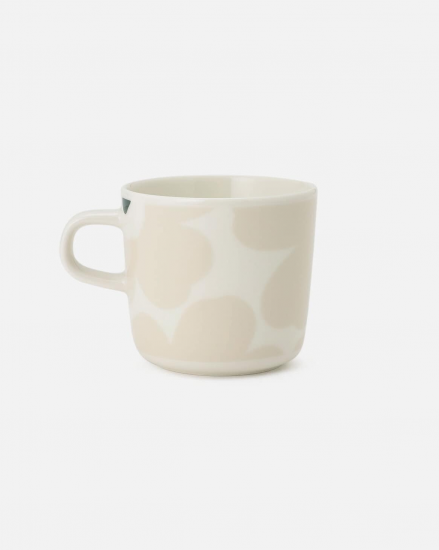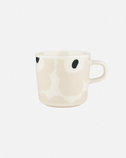 食卓が華やぐUnikko柄のコーヒーカップ。ライトベージュ×ホワイトの配色は上品さが感じられます。ハンドルがコンパクトに仕上がったスタイリッシュなシルエット。普段使いはもちろん、ホームパーティなどのおもてなしでも活躍します。お揃いのボウルやプレートとお使いいただくのも統一感が出て素敵です。