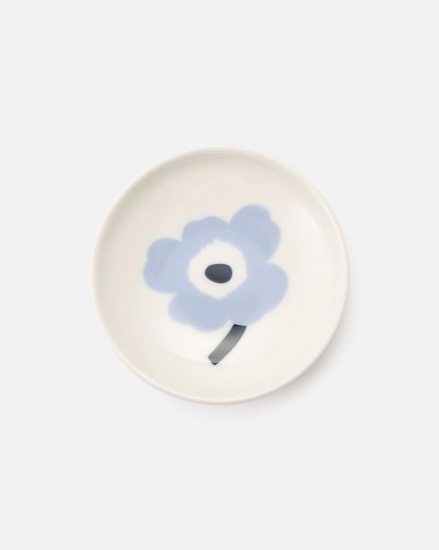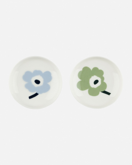ウニッコ柄のプレート2点セット。ライトブルーとセージのやわらかな色使いでちょっとした取り皿としてやお菓子を乗せるテーブルウエアにはもちろん、アクセサリーや鍵など小物の一時置き場としてなど、自由な使い方を楽しめるサイズ感が魅力です。