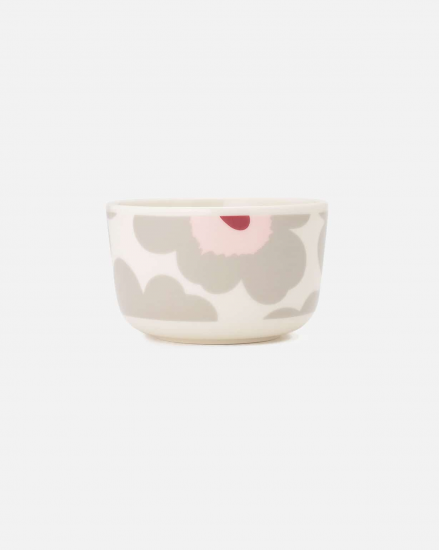 ライトグレーのフラワーモチーフを全体にあしらった、日本限定Unikko柄のボウル。ライトピンクとレッドが差し色に。サラダやフルーツ、ヨーグルトやシリアルなどを盛り付けるのに最適なサイズ感で日々活躍します。