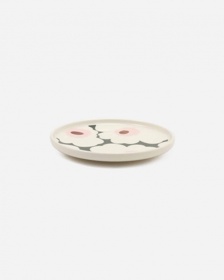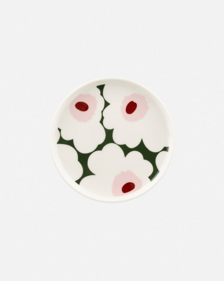 花をモチーフにしたUnikko柄が卓上で存在感を放つ日本限定のプレート 。フチが少し高くなった丸型フォルム。小ぶりな13.5cmサイズは使い勝手が良く、前菜やスイーツなどの取り分けにも活躍。ホワイトとダークグリーンをベースに、愛らしいライトピンクをアクセントにプラスしています。