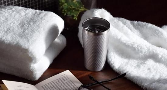 ステンレス二重構造のタンブラー。真空断熱構造になっているため保冷・保温性能が高く、飲み物の美味しさをキープしてくれます。人気の今治タオルとセットアップしたアイテムもプラスして。