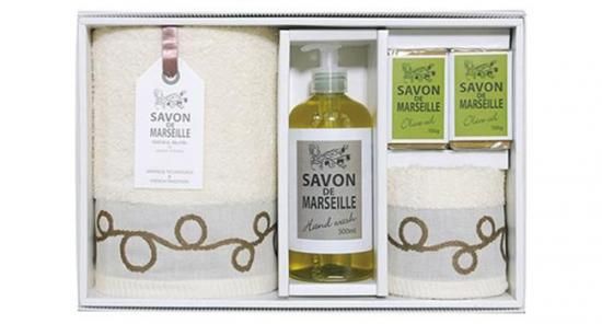 フランスの植物性のお肌に優しいマルセイユ石鹸と、有機精錬イソフラボンソフト加工を施したお肌と環境にやさしい国産タオルをセットした、手洗い推奨セットです。低温処理を可能にし、CO2を削減した天然酵素精錬、ジャガイモから抽出されたデンプン糊使用で、化学薬品を使用していない安心タオル。大豆(胚芽)が原料の発酵豆乳に含まれる「イソフラボン」でソフトな風合いに仕上がっています。【タオル Towel】有機精錬であるイソフラボン加工で、ソフトな仕上がりが肌に優しいタオルです。ヘムにおしゃれな刺繍を施して、機能ばかりでなく可愛いタオルに仕上がりました。【リキッドソープ Liquid soap】使いやすい液状になったオリーブのハンドソープ。フランス・マルセイユの植物性オイルを使用しています。オシャレなパッケージも魅力です。【オリーブソープ Olive soap】フランスの土地に根付いた長い歴史を持つマルセイユ石鹸。歴史を受け継ぐように、今も世界中で愛されている石鹸です。ギフトでも人気のアイテム。マルセイユ石鹸で知られるフランスのマルセイユの植物性オイルを使用した、肌に優しいハンドソープとオリーブ石鹸に、有機精錬イソフラボン加工を施した肌の健康と地球環境に配慮した、優しいセットです。