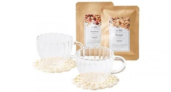 果実の美味しさがギュッと詰まったドライフルーツの「食べられるお茶」。完熟フルーツのときめく香り、お口に含んだときの甘みと酸味、個性豊かなカラーリング。あたらしいお茶のカタチをお楽しみください。お茶の色味が楽しめる、光を反射してきらきら輝く耐熱ガラス製のペアカップと一緒にお贈りします。