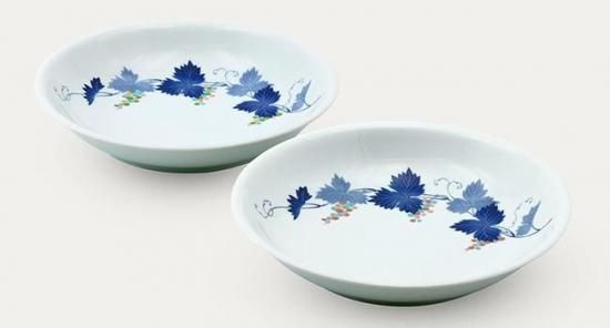 香蘭社の伝統モチーフである「ぶどう」のデザインです。ぶどうは古くから「縁結び・夫婦円満・子孫繁栄・豊穣・商売繁盛」などの意味にたとえられ、とても縁起の良い絵柄となっています。染付の葉に色とりどりの実がアクセントになっていてすっきりした中にも可愛らしさのある使い勝手の良いプレートです。ペアの商品は ご結婚のお祝いやご夫婦への贈り物にもお勧めです。明治時期に誕生した「香蘭社」は、有田磁器に優美な染付と華麗な赤絵を配した典雅な文様や、金彩、銀彩、ルリ釉、グリーン釉など多彩を極め、有田磁器の世界をリードして参りました。