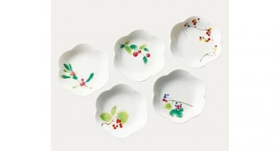 四季の風景を彩るやさしい自然の木々の実をデザインはさりげなくお料理を引き立ててくれます。飽きの来ないデザインで贈り物にも人気の商品です。どの角度から見ても 木の実のデザインが見え、テーブルをやさしい雰囲気で彩ります。サルトリバラ、野ブドウ、キイチゴ、ヤマモモ、ツルウメモドキの5つのデザインが楽しめる小皿のセットです。明治時期に誕生した「香蘭社」は、有田磁器に優美な染付と華麗な赤絵を配した典雅な文様や、金彩、銀彩、ルリ釉、グリーン釉など多彩を極め、有田磁器の世界をリードして参りました。