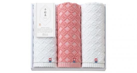 吉祥柄「七宝」をあしらった紅白のおめでたいタオルセットです。タオル産地として、日本一を誇る愛媛県今治市。伝統の技術で織り上げました。